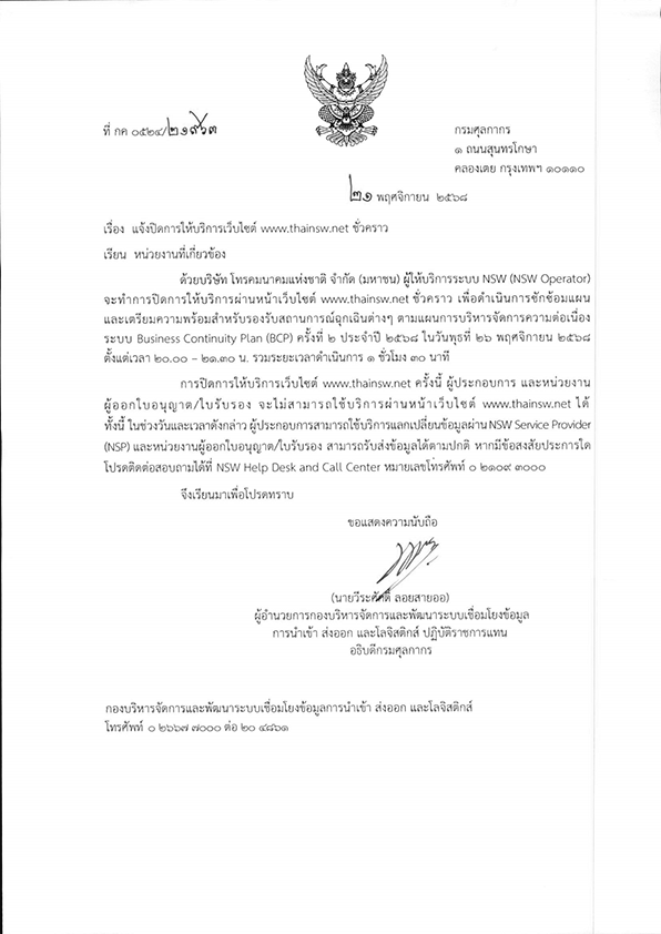 กรมศุลกากร แจ้งปิดให้บริการเว็บไซต์ www.thainsw.net ชั่วคราว